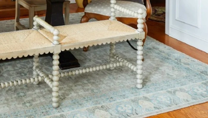 For a more timeless, collected feel, Marlene started with a beautiful, light palette to balance the dark walls, drawing inspiration from a beautiful area rug from The Rug Bazaar at INTERIORS HOME. A rustic table and side chairs, 2 upholstered arm chairs and a cottage-style bench came together to create seating for six without the formal feel. The sideboard was replaced with a charming, functional cabinet and the old chandelier replaced with an understated but elegant crystal chandelier. The result is a refined but charming look, and most importantly inviting–exactly what Layla had hoped for.