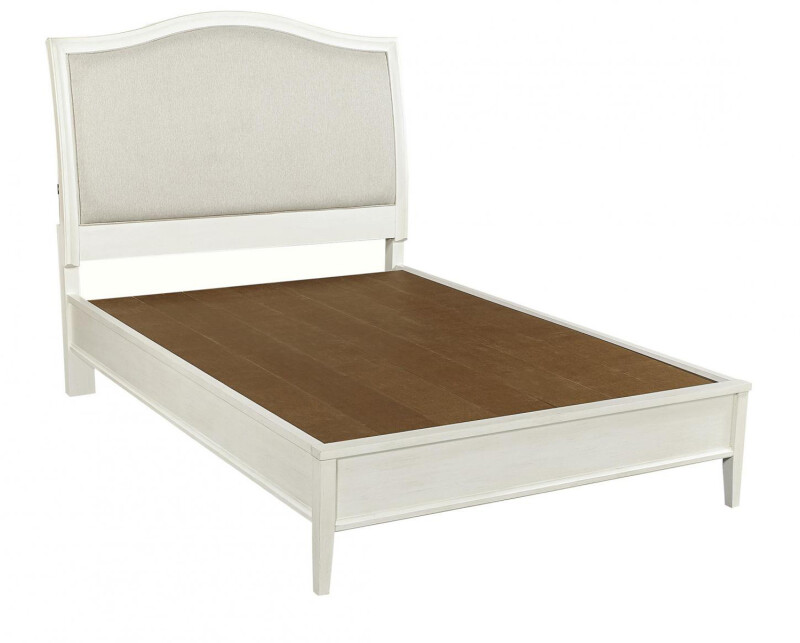 Drawing inspiration from classic design styles along with a hand worked dry brushed finish over a white base coat. The case pieces have gracefully bowed fronts that tie into the camelback style, beautifully upholstered sleigh headboard. The tapered leg design creates a light visual stance to the collection.