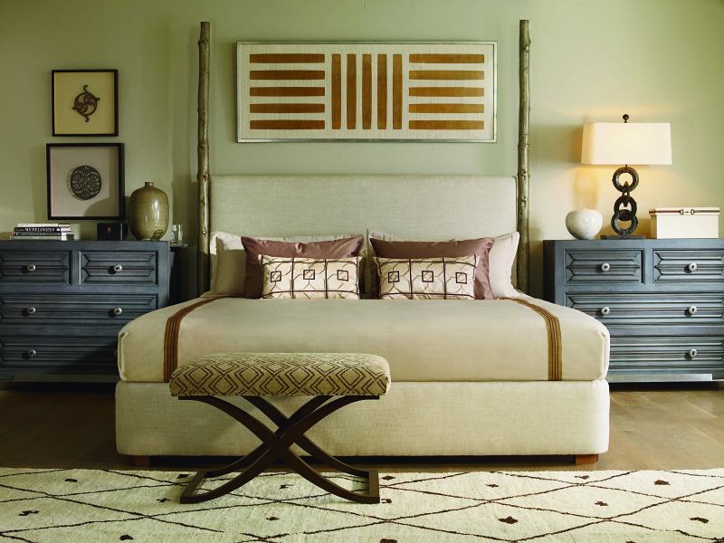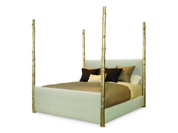 This luxury upholstered bed features an upholstered headboard, side rails and footboard with two faux bois aluminum posts. The texture of the posts with their knots and groves and gently tapered appearance lends an overall organic quality to the Wildwood. Available in any Century fabric or COM and also available with different finishes on the posts.