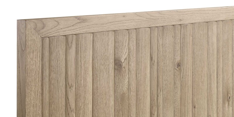 Neo-rustic panel bed with textured oak reeding in a sleek, Modernist-inspired frame; a plinth base creates a floating effect.