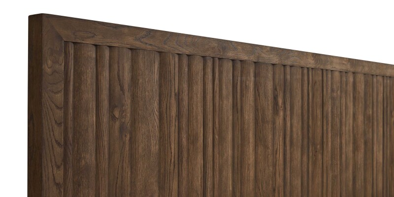 Neo-rustic panel bed featuring textured oak reeding encased in a sleek, modern frame with a vertically grained headboard. A plinth base creates a subtle floating effect.