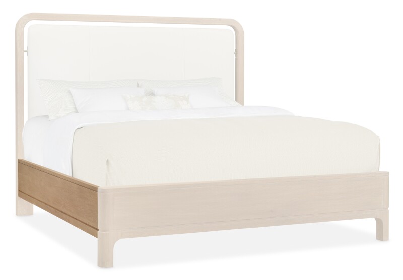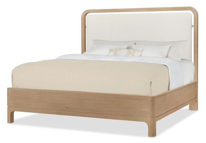 The Banyon Bay King Panel Bed in the Sunbleached leather is a stylish and spacious option for your bedroom. Constructed from white oak solids, oak veneers, and finished leather, the bed showcases a multi-step Desert Oak finish with wire-brushing and cerusing for texture. The leather-upholstered headboard features an open frame and metal supports, combining natural materials with modern design. This King-sized bed includes a headboard, footboard, and rails, offering a complete and cohesive look.