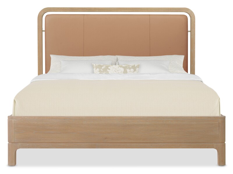 The Banyon Bay Queen Panel Bed in the Toast leather is a perfect combination of modern design and natural materials. Crafted from white oak solids, oak veneers, and finished leather, it showcases a multi-step Desert Oak finish with wire-brushing and cerusing for added texture. This panel bed includes a leather-upholstered headboard with an open frame and metal supports, offering a refined and contemporary look. The bed’s versatile design makes it an ideal centerpiece for any casual, modern bedroom.