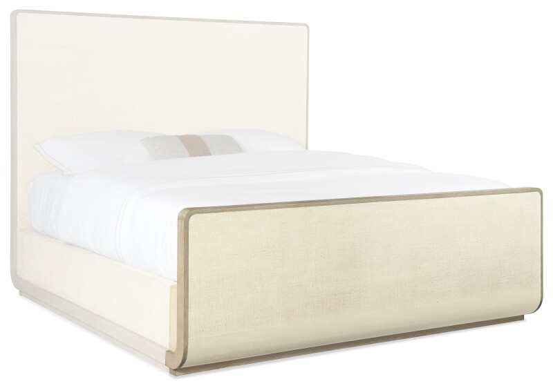 Create a resort-like retreat in your master bedroom with this statement bed in the organic Pebble Beach lacquered burlap finish and trimmed in oak veneers in a soft taupe Terrain color for a serene color palette. Includes headboard, footboard and rails.
