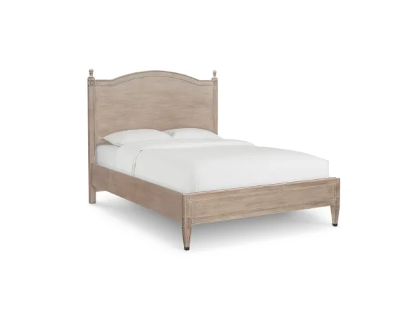 Like the frame of a classic painting, the Charlotte Panel Bed adds old-world charm to the room with its pared-down traditional lines. The shape of the arched wood panel headboard pairs with the simplicity of a low wood footboard. Traditional details include the understated carved rosettes and recessed lines in the bed’s gently tapered legs, metal ferrules, and bedposts with simply turned finials. Modern finishes highlight the details and grain of the elm veneer with moderate distressing and glaze. Choose dark Tavern finish or soft Washed Elm.
