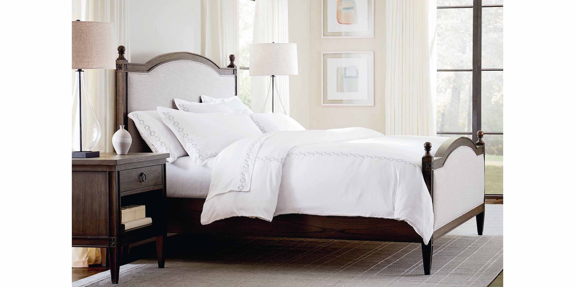 The Charlotte Upholstered Bed with Footboard has all the charm of old-world design with a modern twist. Traditional details include the understated carved rosettes and recessed lines in the bed’s gently tapered legs. Bedposts with simply turned finials and carved rosettes accent the gently curved arch. Modern finishes highlight the details and grain of the elm veneer with moderate distressing and glaze. The upholstered headboard softens the look with heathered texture fabric in neutral Oatmeal. Choose dark Tavern finish or soft Washed Elm, and select a low wood footboard or tall, arched upholstered footboard to complete the look.