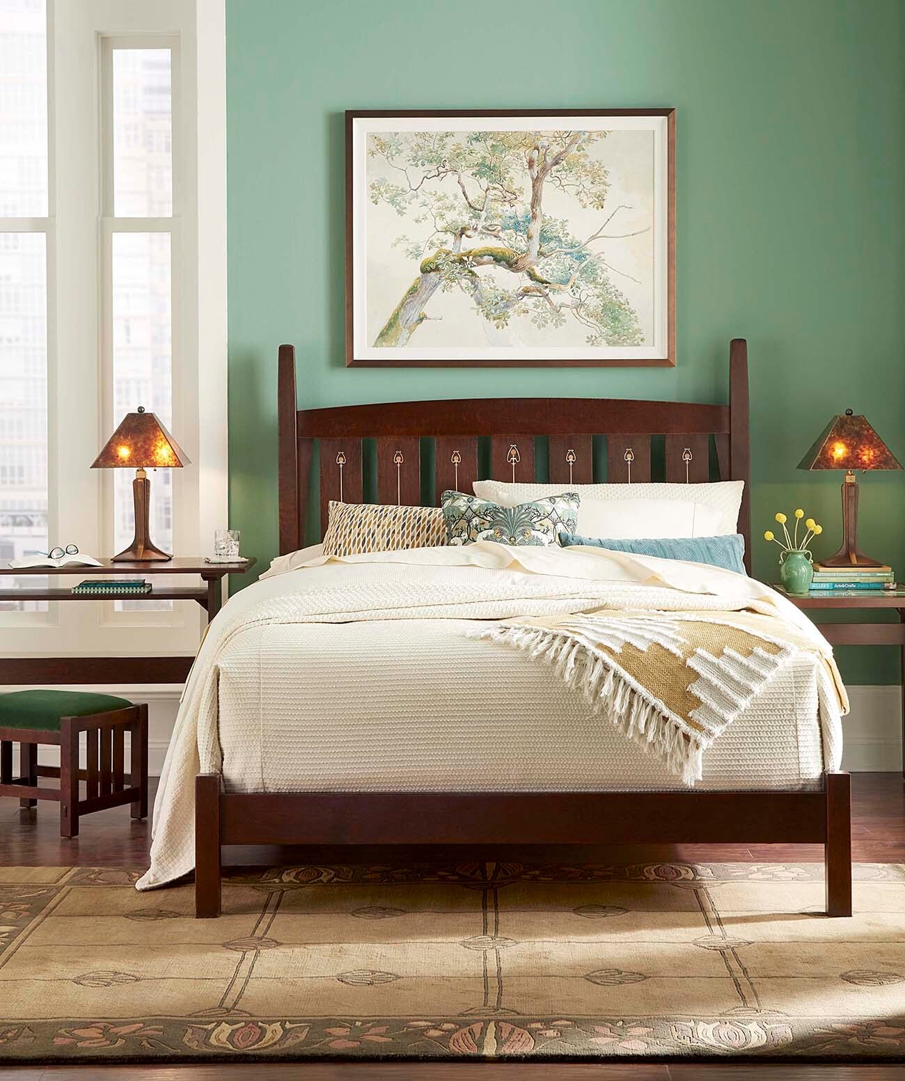 Delicate inlays of ebonized hardwood, cherry, and holly grace the slats of this Mission bed based on an early design by Harvey Ellis. Available in solid oak or cherry, with optional platform storage (16 in. high), and in three footboard styles: tall post footboard (33 in.), mid-height footboard (25 in.), or low-height footboard (14 in.).