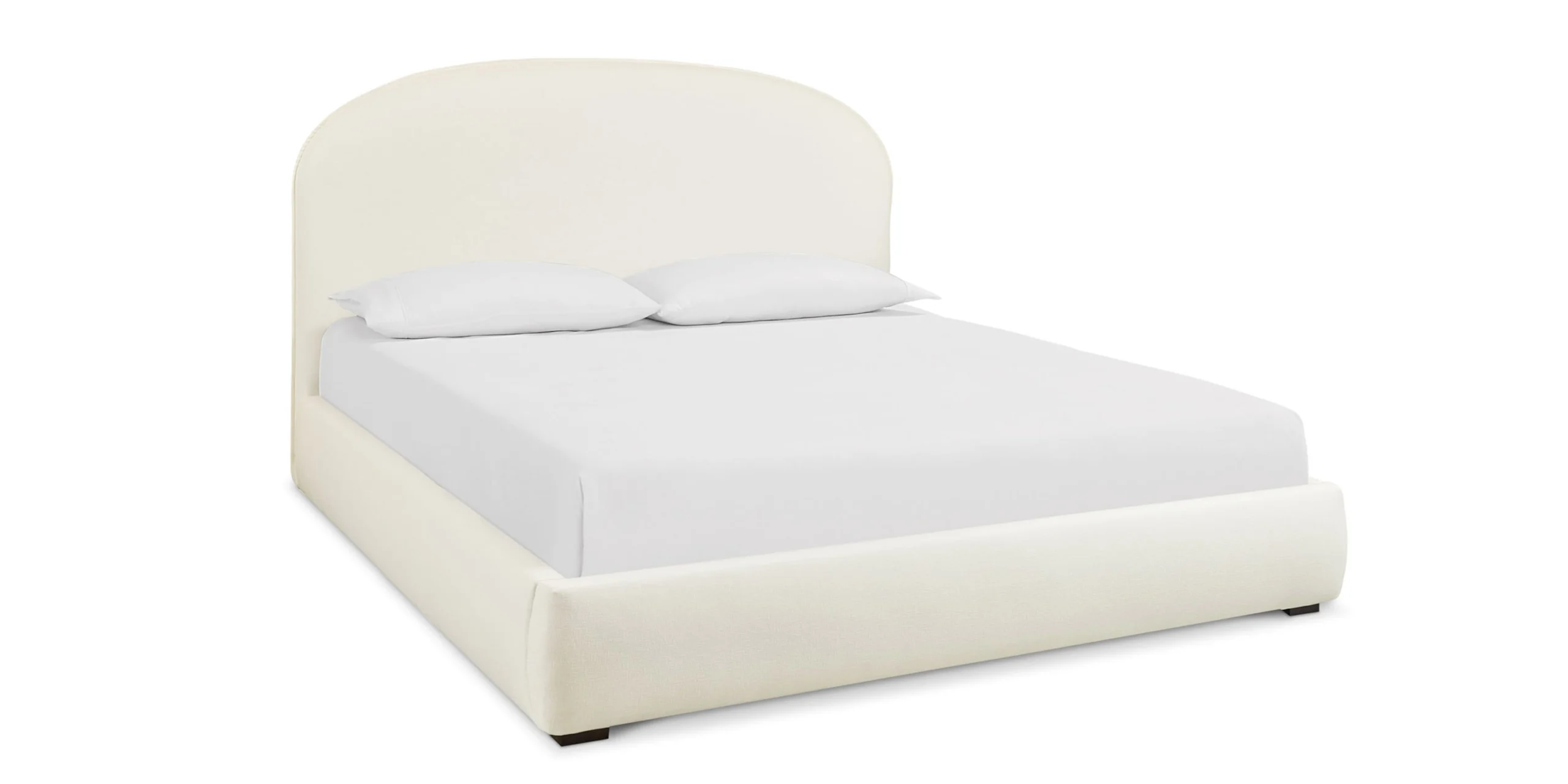 Modern upholstered platform bed with a gently arcing, clean-lined headboard and softly rounded rails, fully upholstered in fabric or leather. Platform design supports your mattress without a box spring.