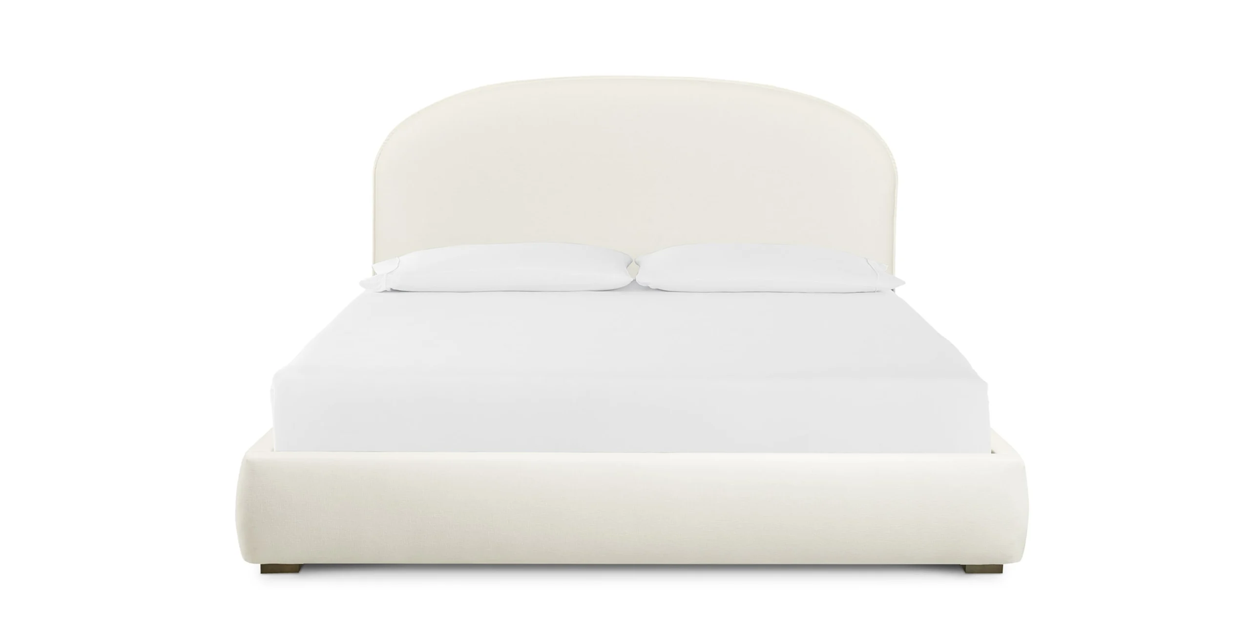 Fully upholstered platform bed with a gently arcing headboard and softly rounded rails. No box spring required; 62 in. W x 85 in. D x 54 in. H.