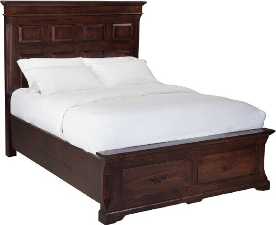 Classic design never goes out of style as evidenced by the beauty of this bedroom set. Design details include an impressively sized paneled headboard and a footboard that includes drawer storage. This set is constructed of solid wood. Our furniture is fully customizable and made to order. You choose the wood species and stain to fit your space. Wood Options for our furniture include Oak, Quartersawn White Oak, Maple, Cherry, Rustic Cherry, Hickory, and Walnut. We also have a wide range of stains and paints to choose from. See the catalog beside Additional Information below for more information. Speak to a sales associate for additional details. Footboard Height 22″ (55.9 cm) Headboard Height 65″ (165.1 cm)