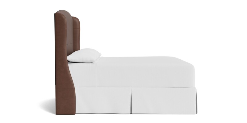 Leather upholstered bed with sheltering curves, available as a complete bed or headboard. Customize with tapered or turned wood legs; in-store options include tufting and nailhead trim.