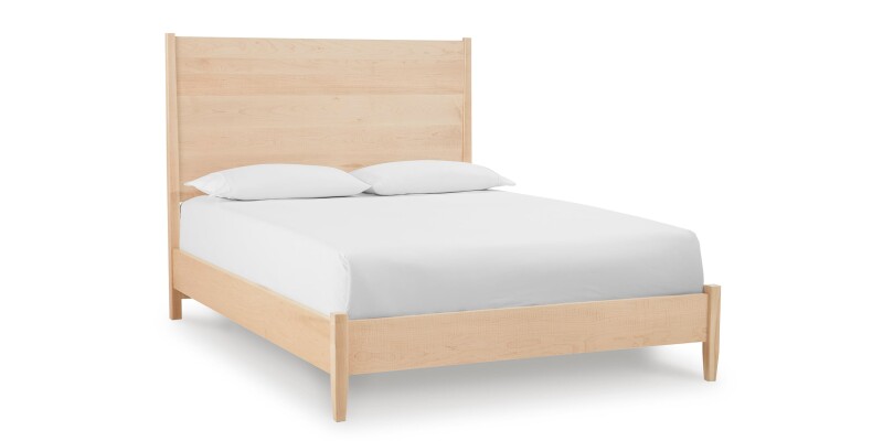 Low-profile panel bed crafted from solid silver maple with a dramatic headboard and modern frame. Artisan crafted in the USA with wood construction and finish options.