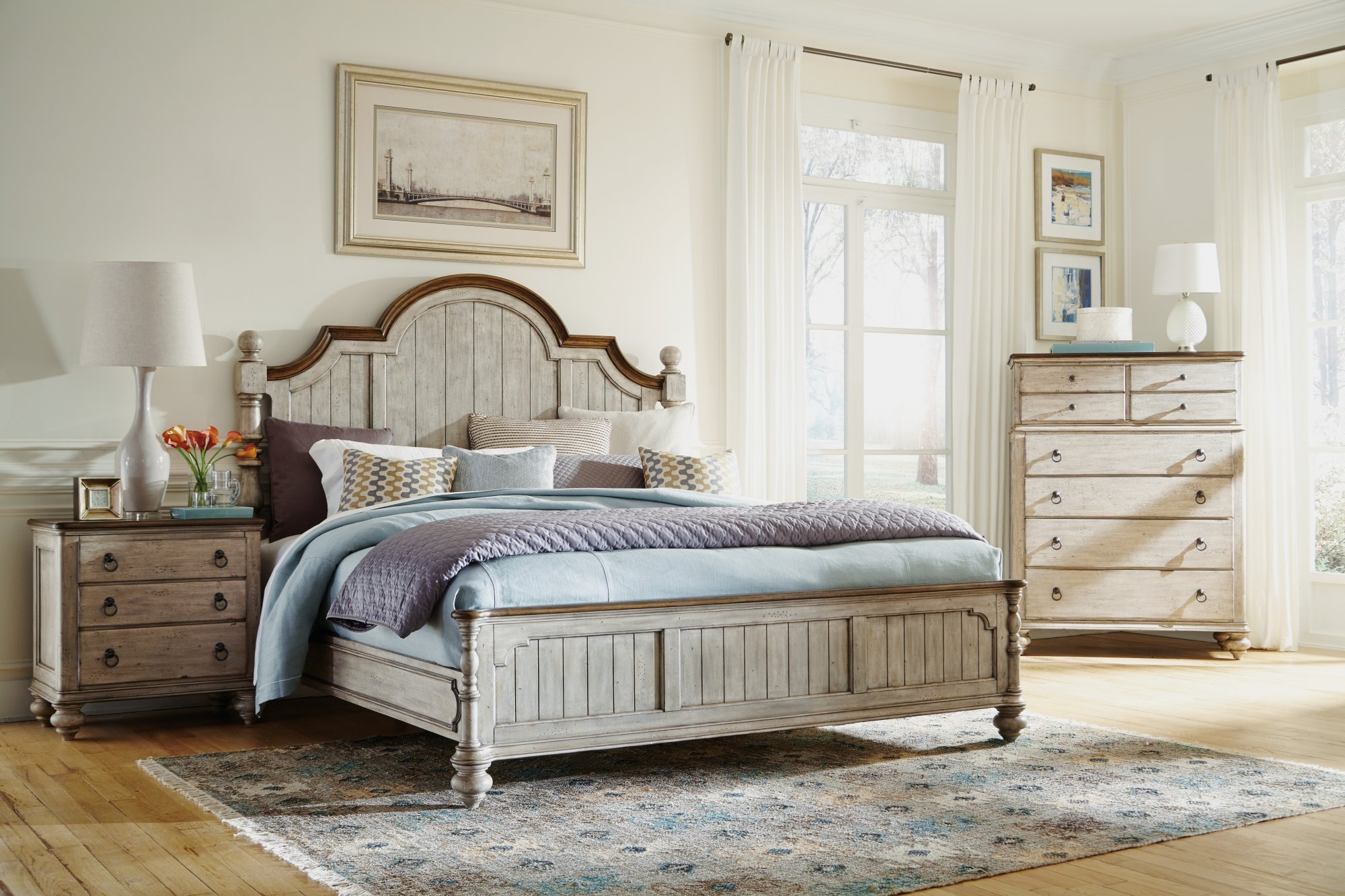 The Plymouth bed boasts a shabby chic design with contrasting wood finishes and paneled construction. With an overall graywash finish accented by dark trim, Plymouth is ideal for those who like a bit of vintage design in their modern lives.
