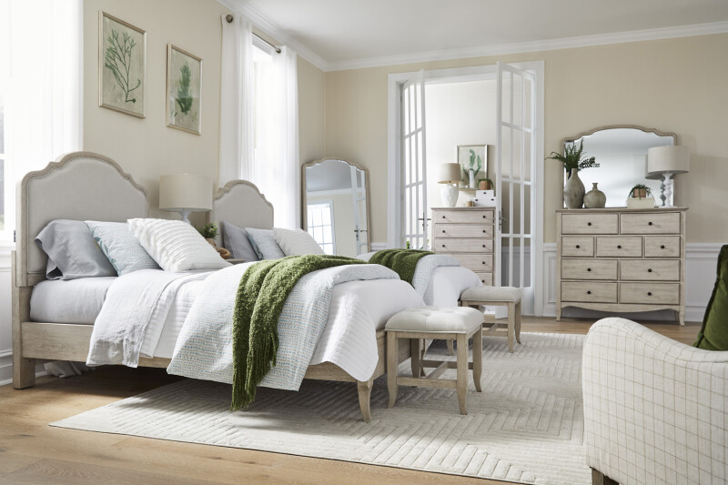 Provence consists of a light, weathered finish on Acacia veneer blending easily with most existing home decor. The gentle curves create a soft, relaxing and livable environment. Custom floral detail knob hardware gives a jolt of excitement turning this classic bedroom into a new classic.