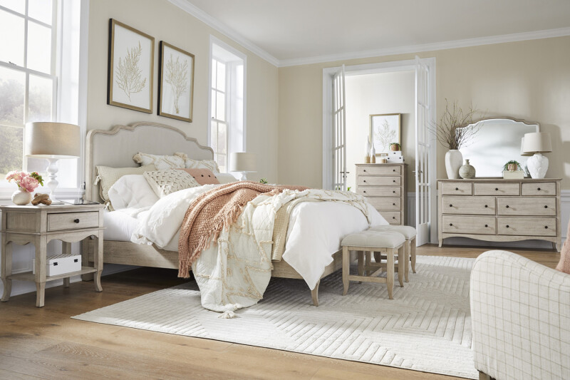 Provence consists of a light, weathered finish on Acacia veneer blending easily with most existing home decor. The gentle curves create a soft, relaxing and livable environment. Custom floral detail knob hardware gives a jolt of excitement turning this classic bedroom into a new classic.