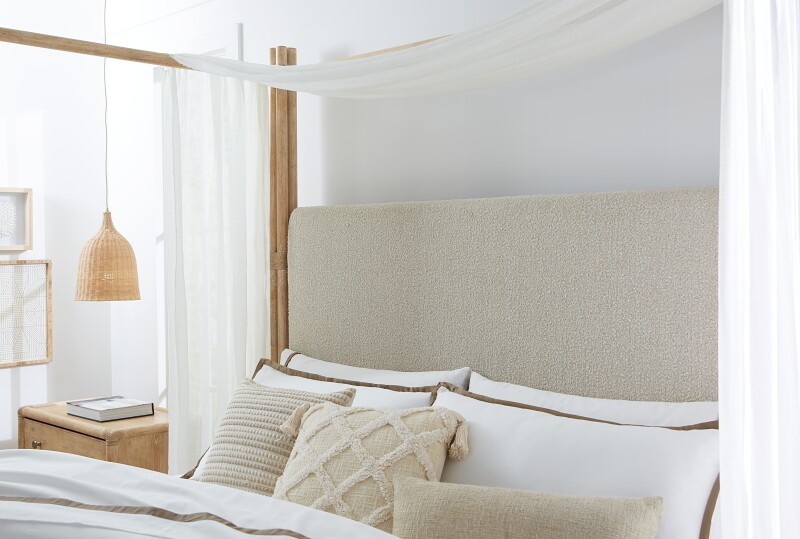 Create a personal oasis inspired by tropical getaways with the Retreat Pole Rattan Upholstered Bed with Canopy. The dramatic bundled pole-designed motif with rope accents creates a laid-back luxury, complemented by the side rails crafted of Oak Veneers and finished in the sand-colored Dune finish, transparent by design to reveal the unique character of the wood veneer. The Neo Cream fabric on the upholstered headboard adds inviting softness and comfort. Includes headboard, footboard and rails.