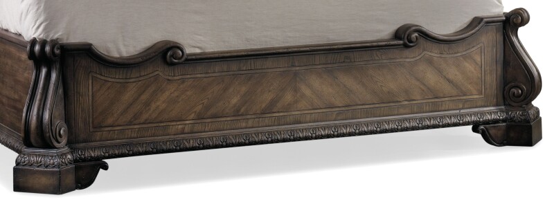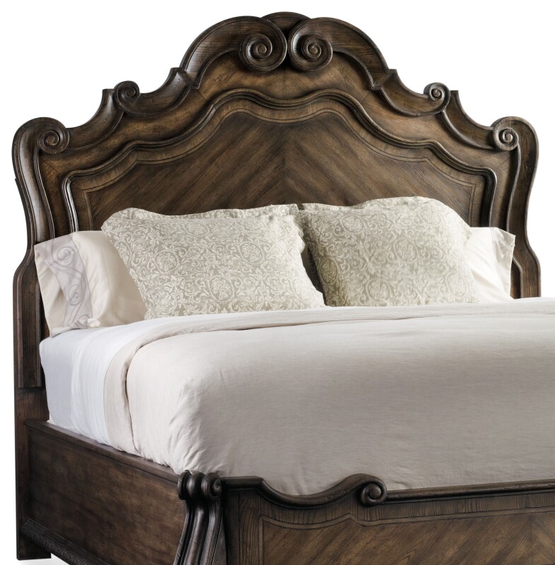 A chevron veneer pattern inspired by a French antique gives a striking appearance to the Rhapsody California King panel bed. Adding to the drama is the elaborately carved headboard, adorned with a grand interpretation of the recurring scroll motif. The final exquisite touch to this focal point piece is the walnut-colored finish inspired by the natural yet rustic nature of reclaimed woods in beautiful patinas. The pecan veneers create character through variations of color tones in the wood, knots and striate. Includes headboard, footboard and rails.
