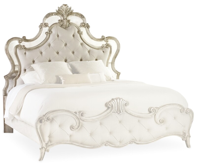 Dream happily-ever-after in a fairy-tale bed you have aspired to all your life. This California King upholstered bed sparkles stylishly in the Bardot finish, an elegant silver leaf with a slightly aged patina and with a border of Antique Mirror. The tufted Samantha Cream upholstery adds softness as the perfect finishing touch. Headboard can be used alone.