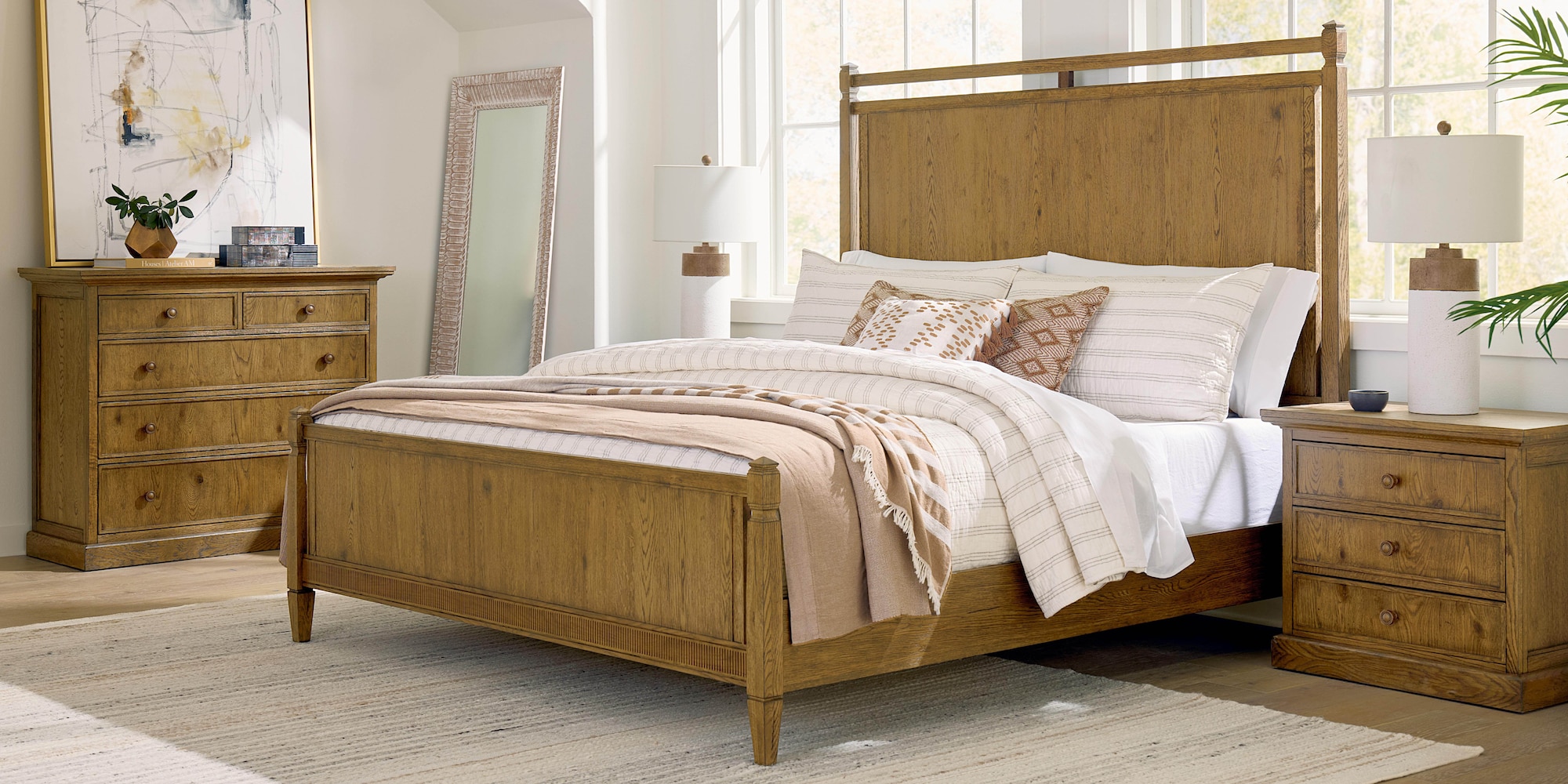 Let your dreams soar as high as the headboard of your Surry Wood Panel Bed. With clean, strong lines and timeless detailing, your bedroom will reflect a fresh design perspective rooted in traditional elegance. Constructed with knotty white oak veneers and solids, Surry is available in either our Flaxen or Truffle finish. Both these finishes highlight the authentic character of its Appalachian hardwood. There’s a headboard only option for this bed, and the Surry collection also includes a dresser, chest, and nightstands to curate your distinctive bedchamber.