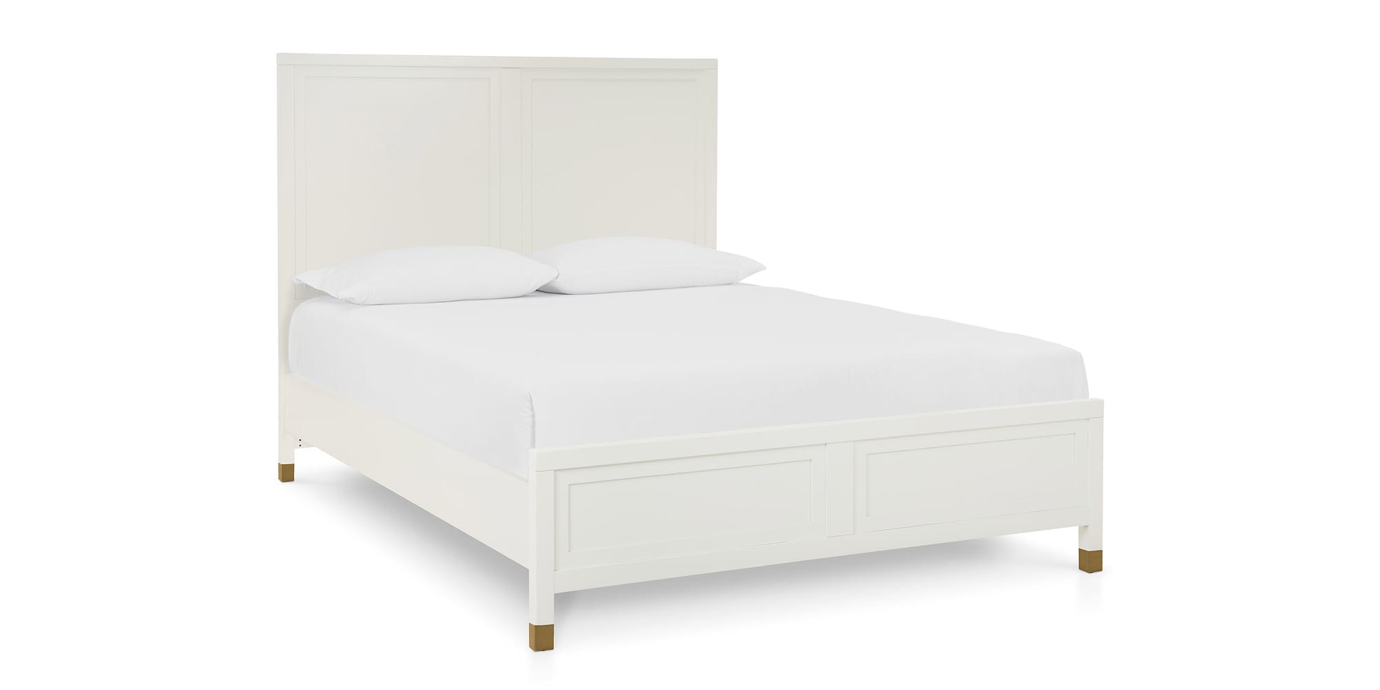 The crisp, white sophistication of the Tidewater Panel Bed will have you dreaming of waves and soft breezes. Make no mistake, this streamlined bed is just as comfortable in an elegant boudoir as it is in a coastal getaway. The raised framing details add dimension to the headboard and footboard. A smooth, opaque Hampton White finish has a modern edge that withstands the test of time. Metal ferrules in satin brass finish add a touch of class to the streamlined legs.