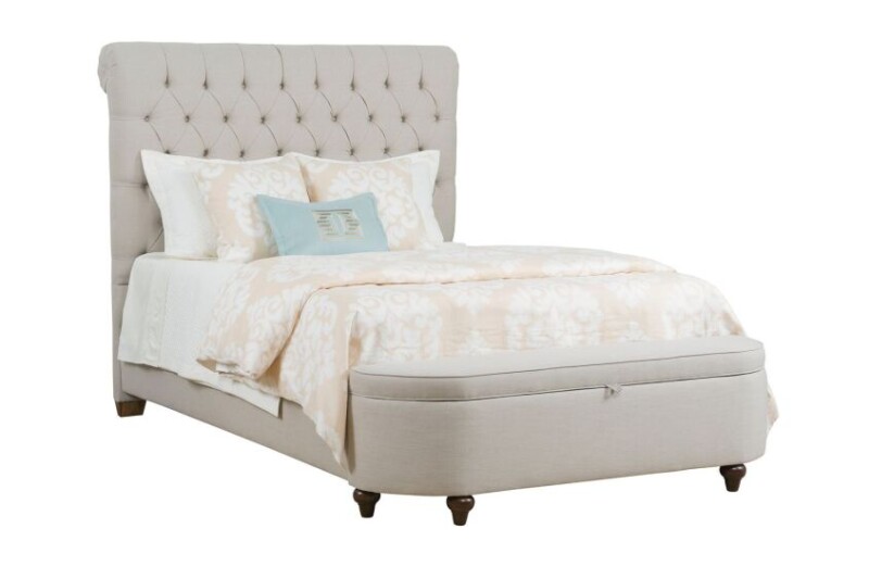 A functional option to complete a Kincaid upholstered headboard is our upholstered storage footboard. It could just as easily be called a “bench footboard” since it is the perfect height to have a seat on! And just like the headboards and matching footboards, it can be ordered in any of our custom order fabrics or in the customer’s own material. The storage space is also upholstered and features a hinged design for easy lift top access. It is also available in King size Queen size and each upholstered footboard includes the matching side rails that will connect it to a Kincaid upholstered headboard.