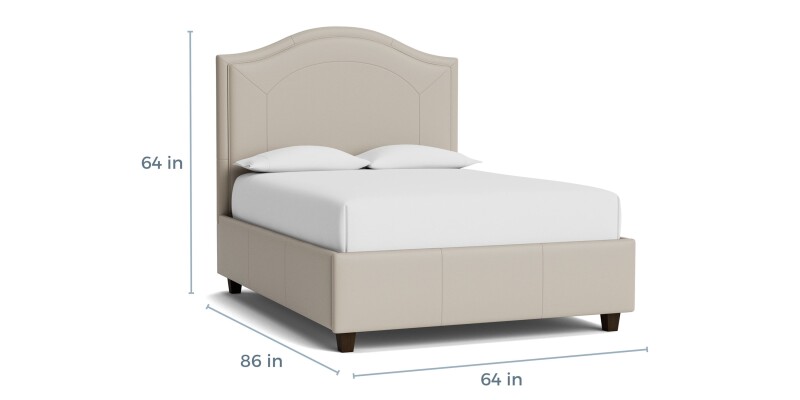 Leather upholstered bed with a camelback headboard for organic-modern or classic style. Customize the leather; choose a headboard or a complete bed with tapered or turned wood legs, in sizes Twin–Cal King.