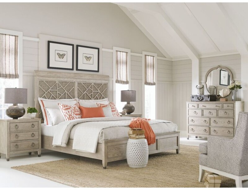 California King reversible wood or seagrass headboard panel in this bed will work in any setting. Beautiful grid work to finish off the look. Also available in queen and king sizes.