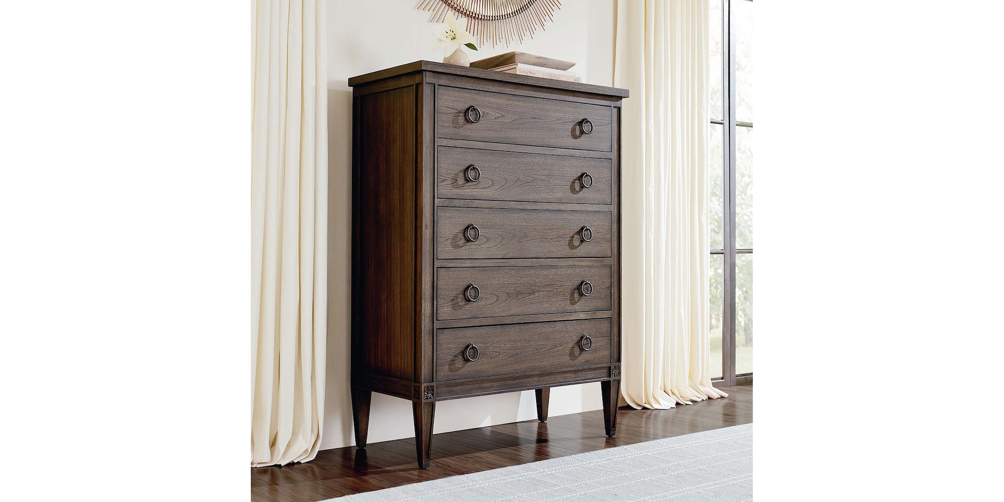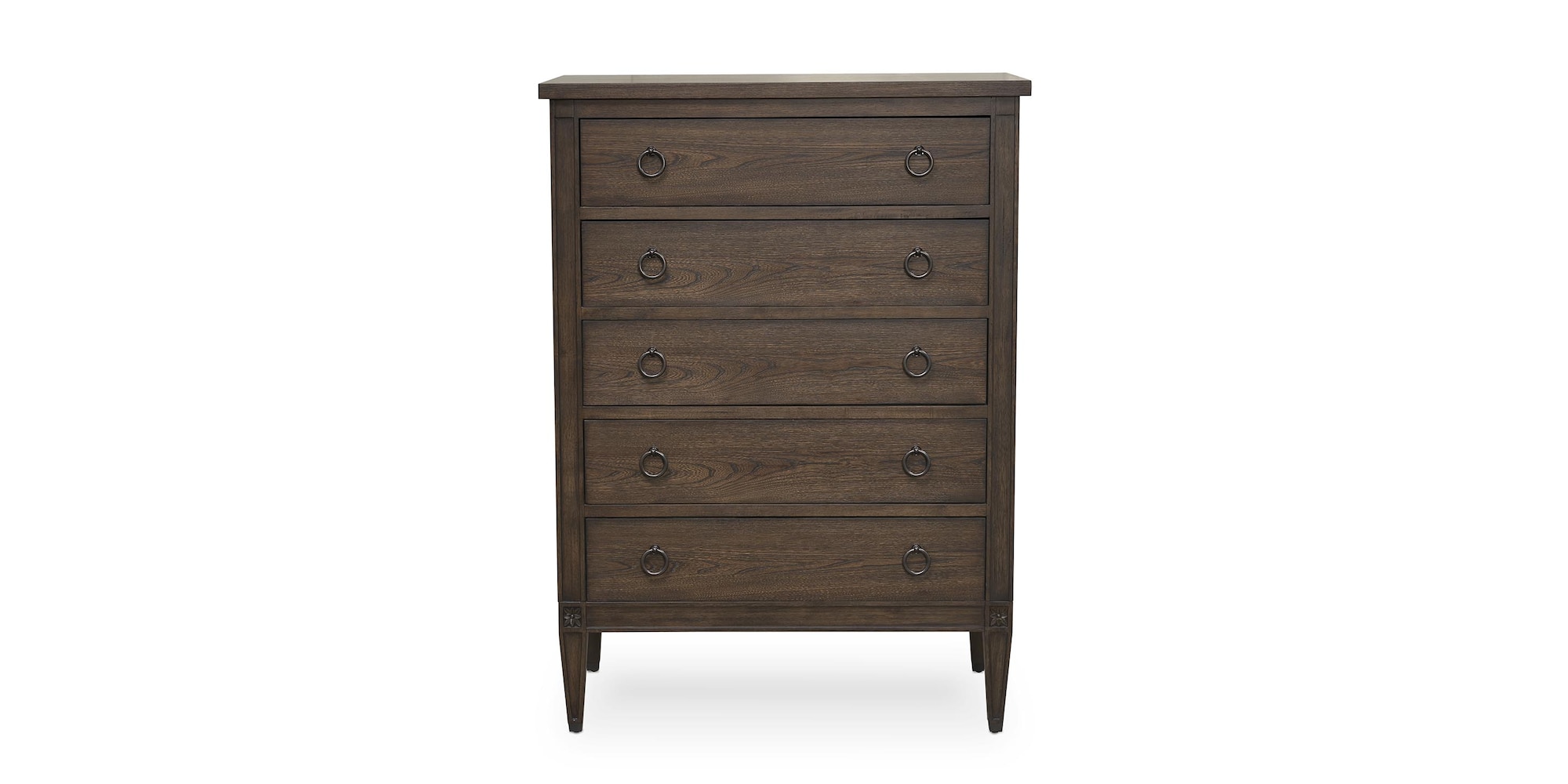 An updated take on old-world elegance, the Charlotte 5 Drawer Chest brings a timeless look of lasting quality to the bedroom. Details like understated carved rosettes, recessed lines, and metal ferrules accent this tall chest’s tapered legs. Soft-close drawers feature metal ring pulls in a Antique Pewter finish reminiscent of matte antique brass. A moderately distressed and glazed finish accents the unique grain and carved details of the elm veneer. Choose a rich, dark Tavern finish or a light, soft Washed Elm finish.