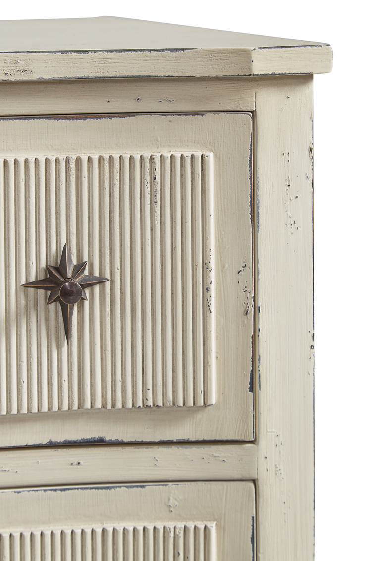 Sure to be the star of your home, this concave two drawer chest perches on slender tapered legs which accentuate its petite appearance. The framed drawers and sides feature a unique reeded detail for subtle visual impact, and the antique brass pulls are simply stellar! A light touch of gray rub enhances the aged cream finish, making this little beauty sure to shine where ever it is placed in your home!