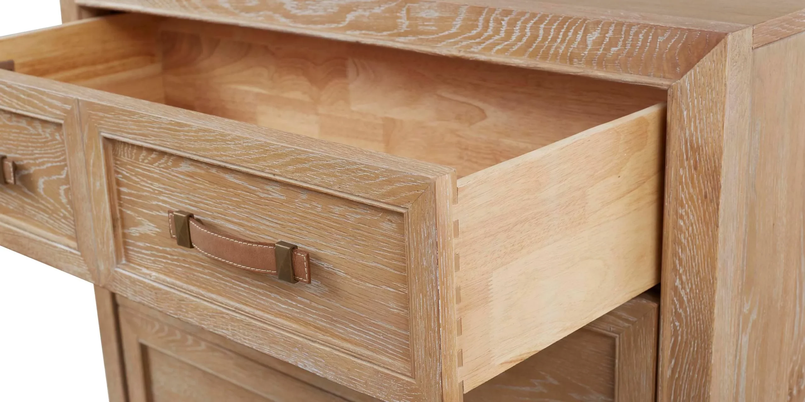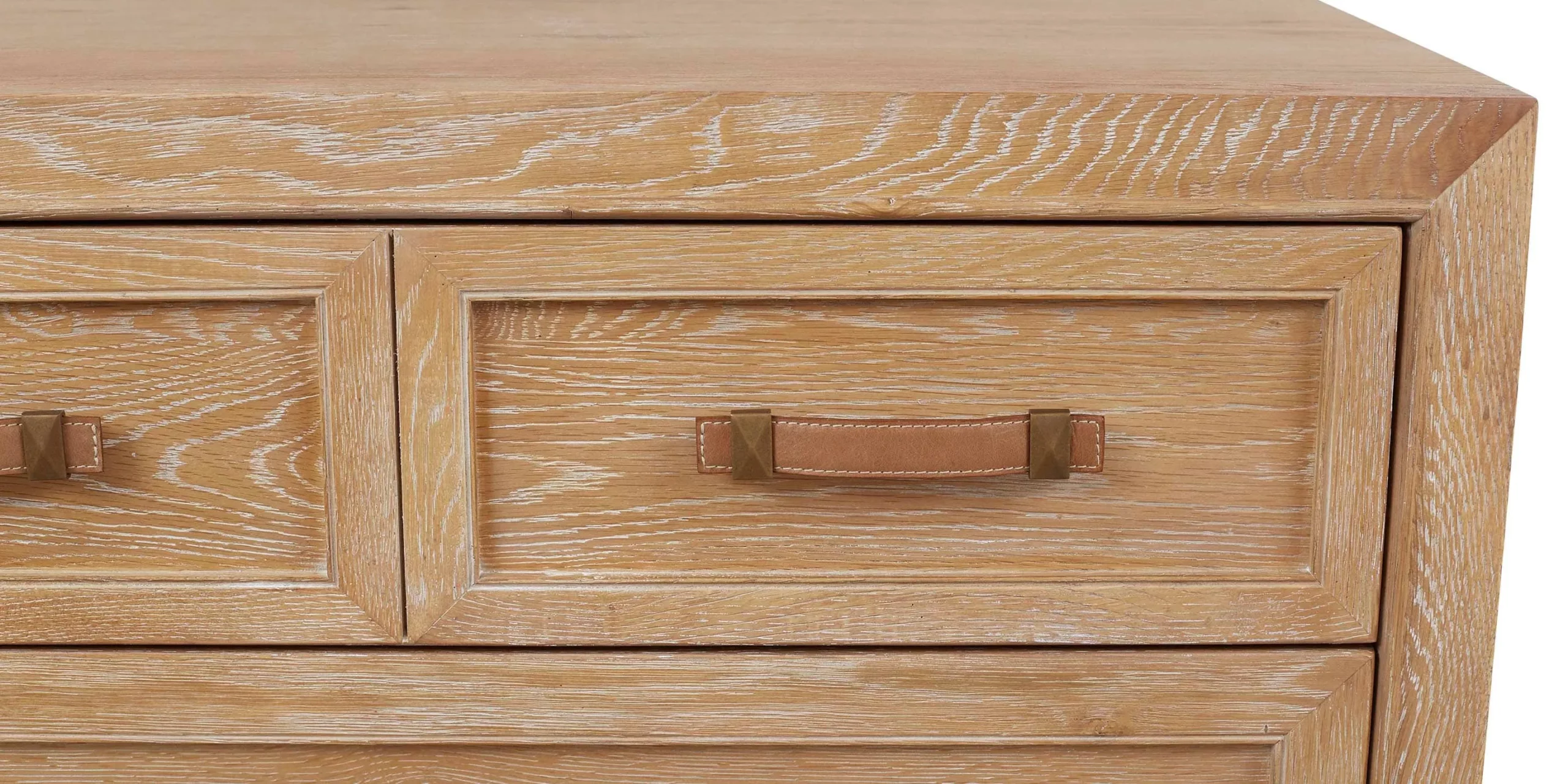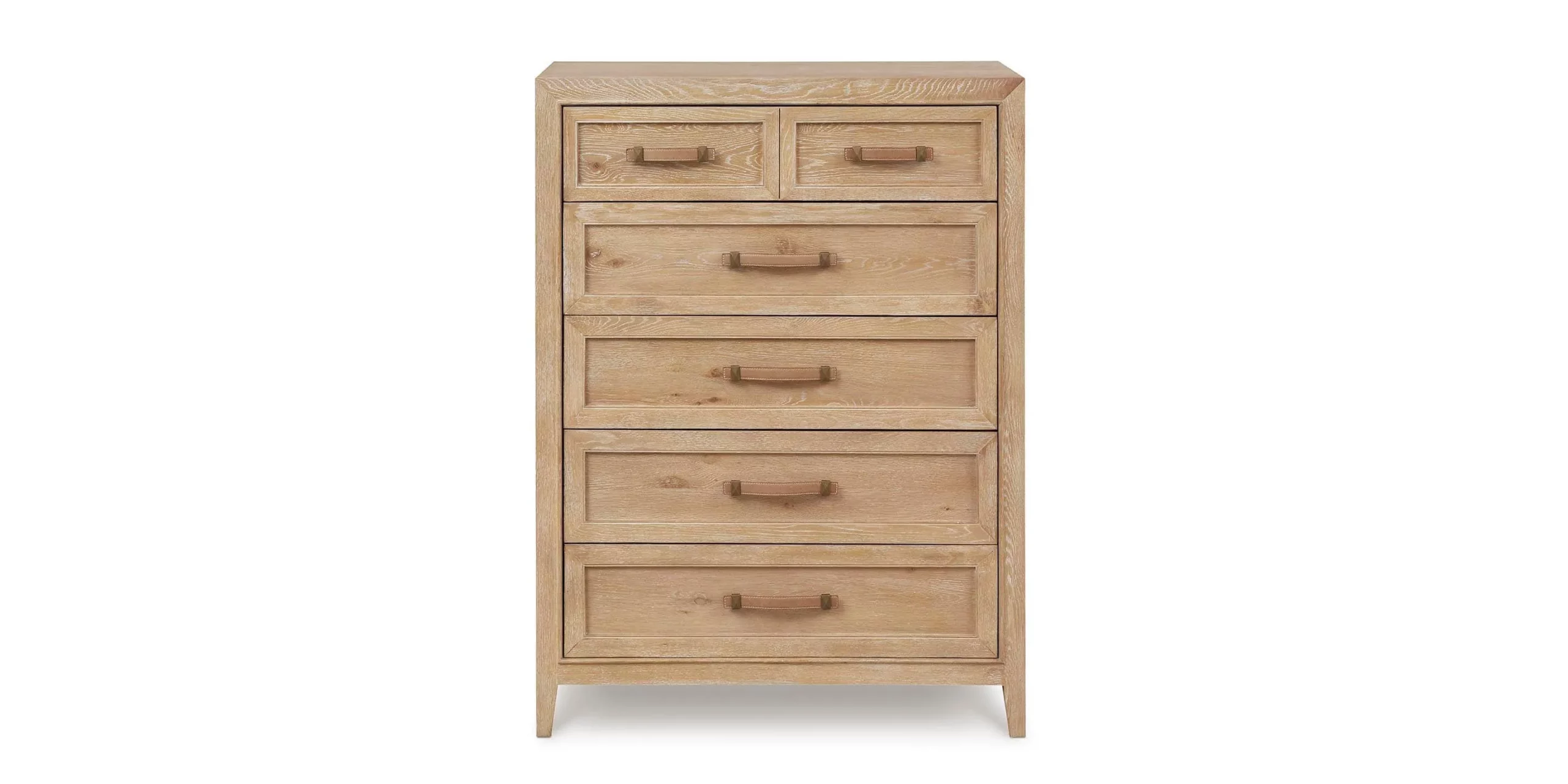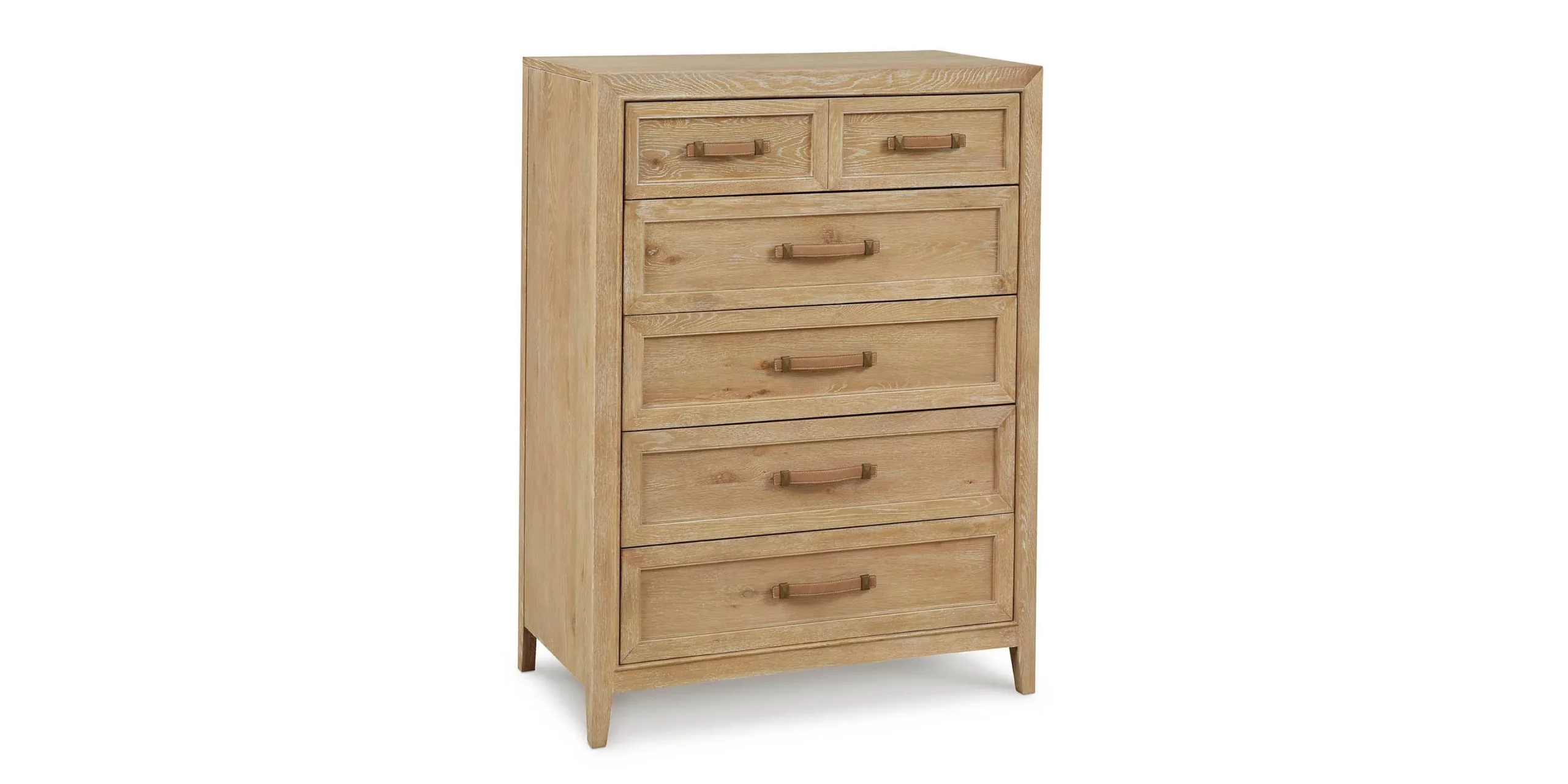 More than just a storage piece, the Courtland Five Drawer Chest in white oak with bronze and leather pulls sets the stage for casual elegance. Its simple lines accented with subtly rich design details like Italian leather pulls fastened with solid brass will endure the test of time. A light hand brushed blond finish highlights the unique woodgrain of flat sawn white oak, and five soft-close drawers offer plenty of storage. The bottom drawer is lined with aromatic genuine cedar to keep clothes clean, fresh, and dry. You’ll find quality in craftsmanship with details like mitered corners, dust dividers, dovetail drawer joints, and a wood back panel.