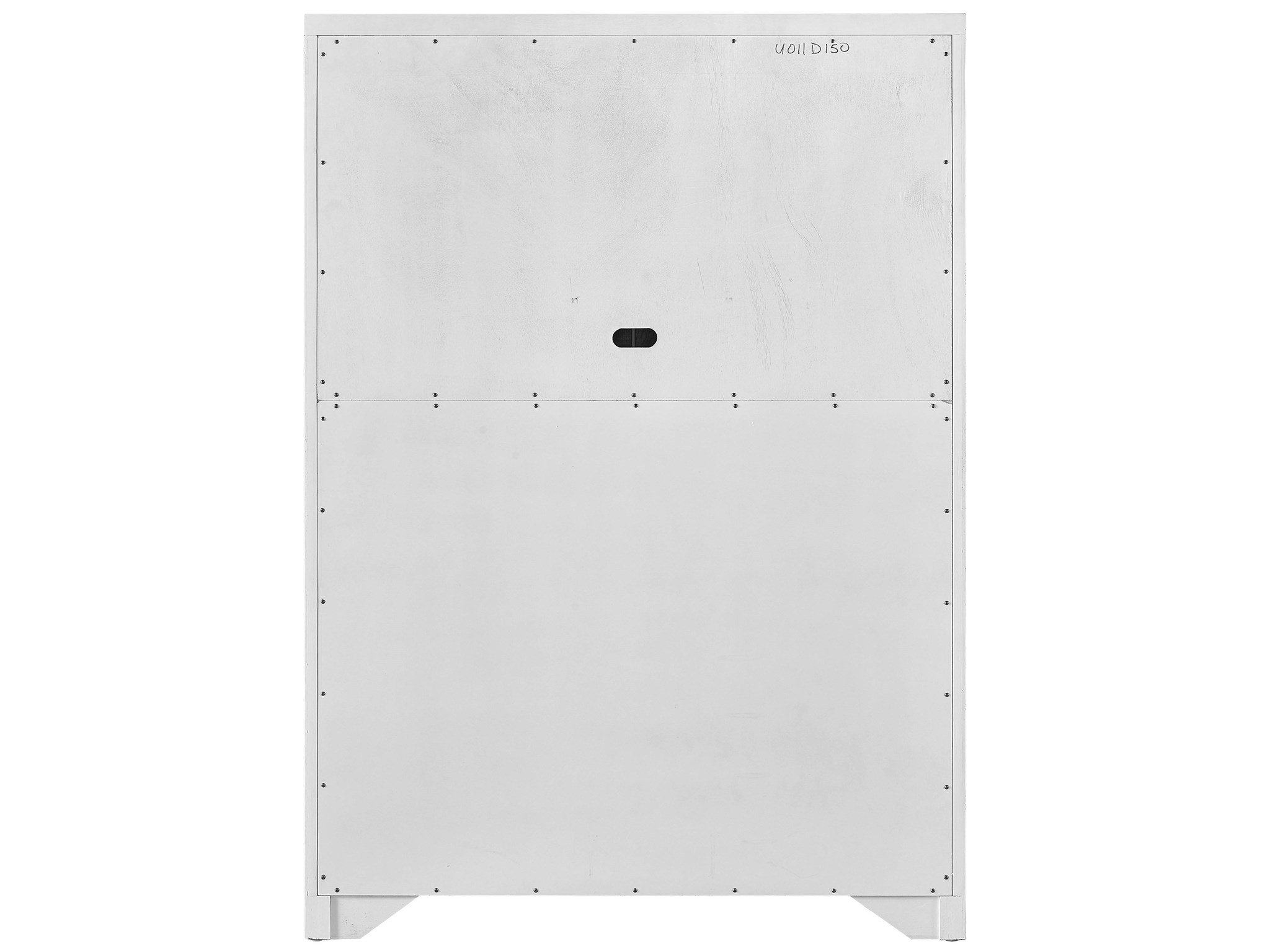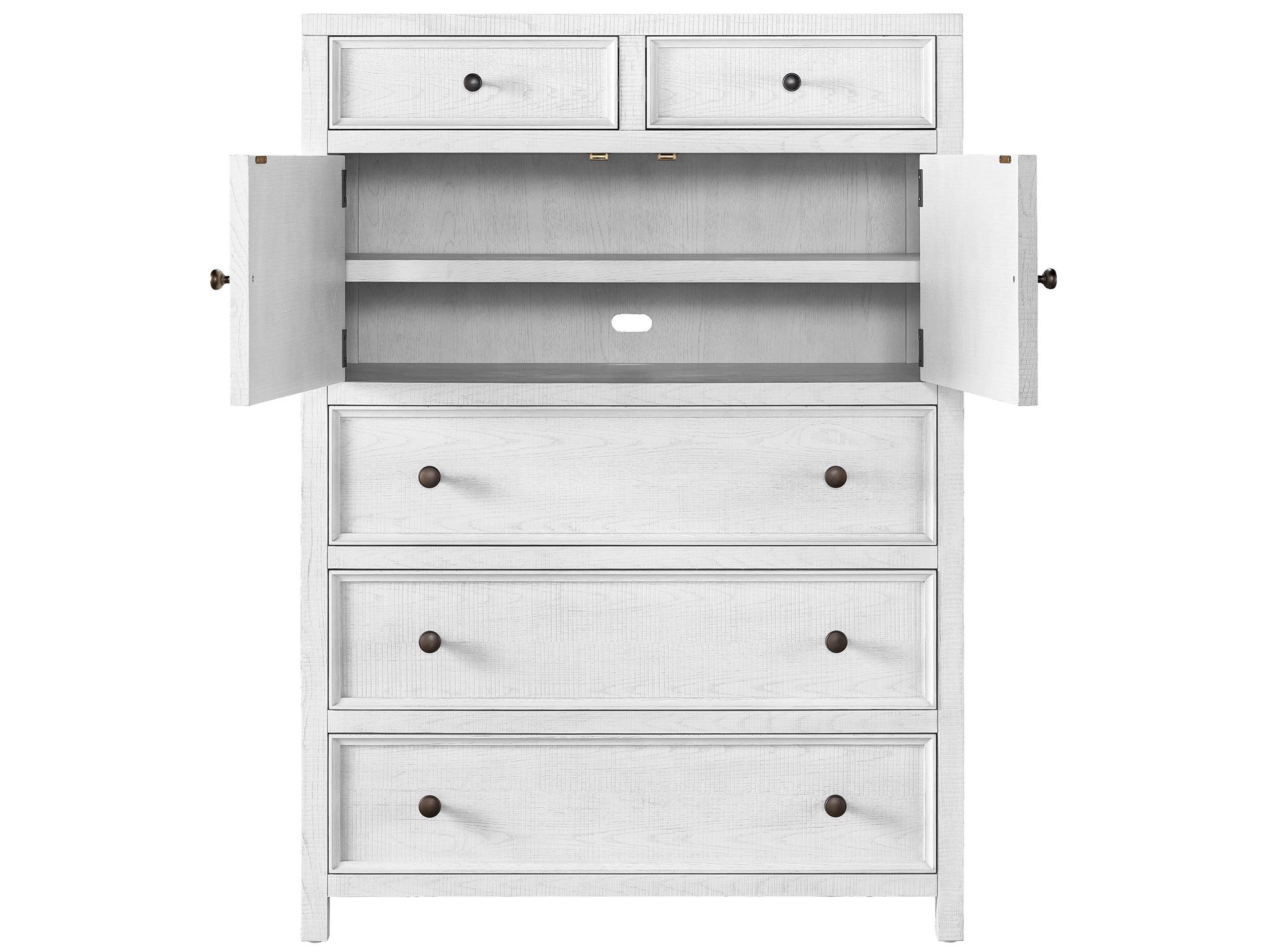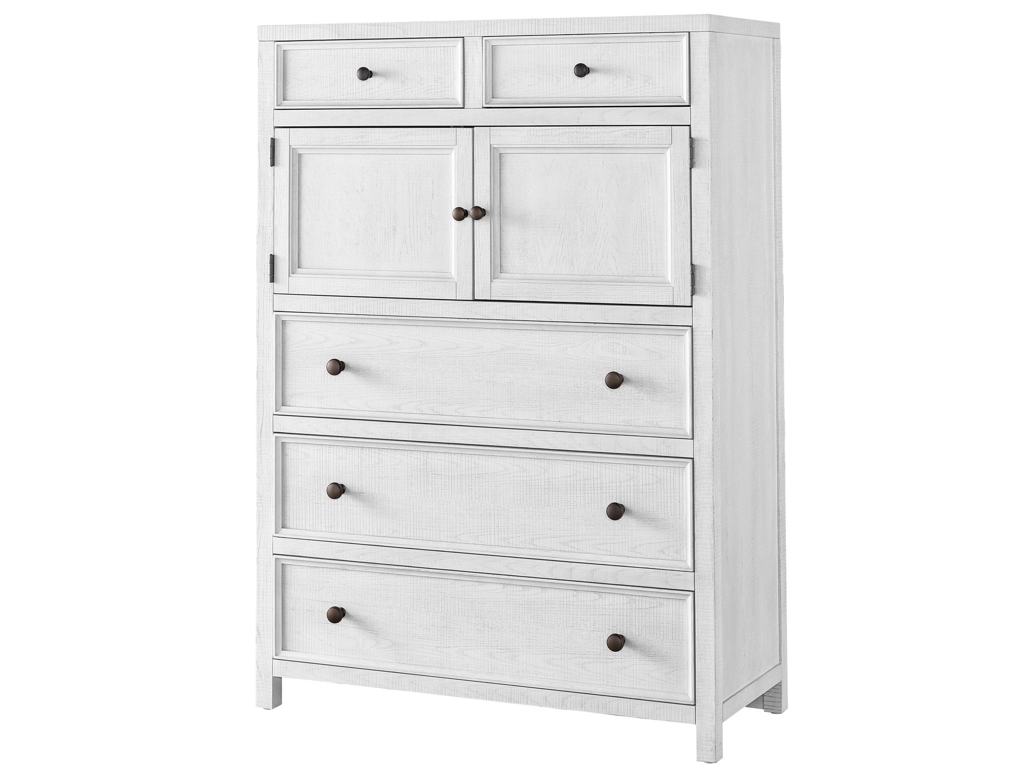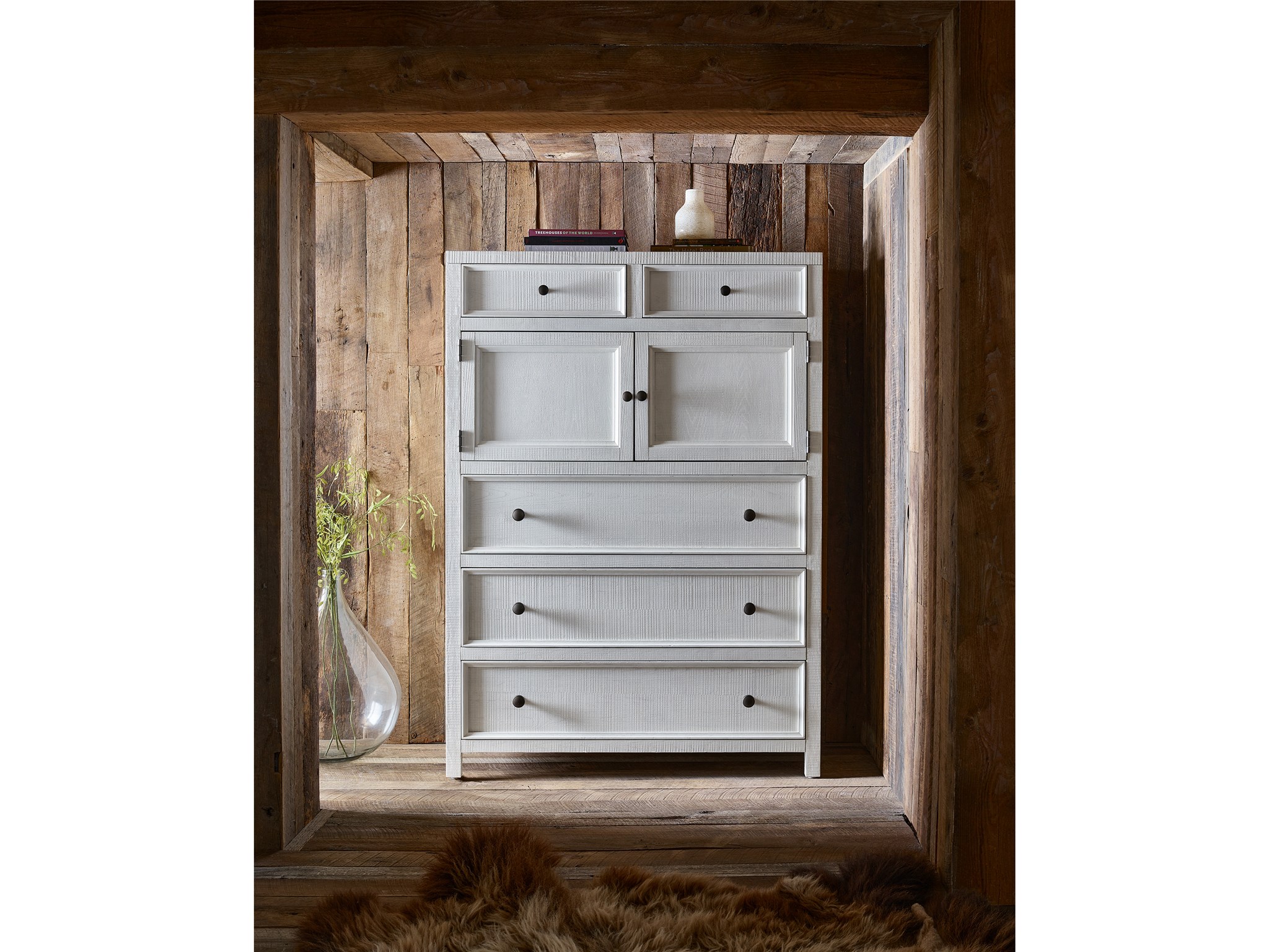 This versatile five-drawer chest also includes two doors that open to reveal shelves and a convenient cut out for wire management. The lowest drawer has a cedar bottom and the chest comes in a rustic oak finish.