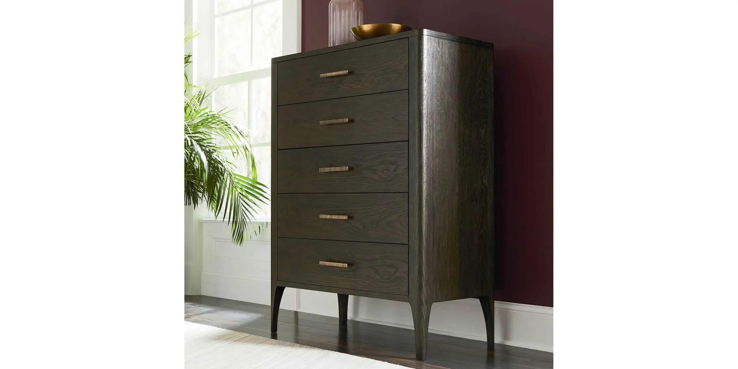 The MODERN Rivoli Five-Drawer Chest dresser exudes elegance and minimalism, allowing it to enhance nearly any decor. The oak, which has a multi-step dimensional finish, comes in either Lyon Brown or Normandy Gray. Soft, self-closing mechanisms keep drawers neatly closed, and the ribbed, metallic hardware offers beautiful finishing touches. Visit our stores for additional customization options.