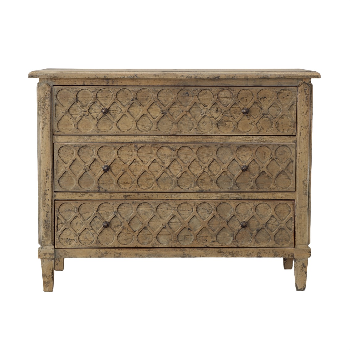 Soft charcoal distressing adds life, and a touch of age, to this handsome pine three drawer chest. The eye-catching drawers feature a unique tear drop and diamond lattice which creates a play of light and pattern on the drawer faces. This handsome chest is just crying out for your favorite artwork to be displayed above it!