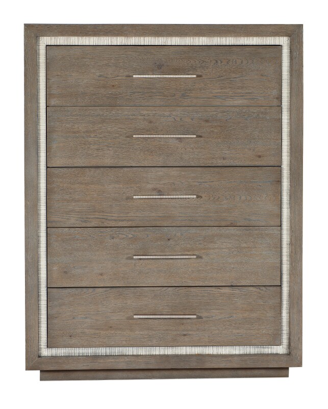 In a crisp two-tone finish combining a gray washed oak with a contrasting textured light gray color, the Serenity Five-Drawer Chest brings the organic textures of cottage waterfront living to your space. Crafted of Oak Veneers and resin, the drawers have soft-close drawer guides, the top drawer has a removable black felt liner and the bottom drawer is cedar-lined.