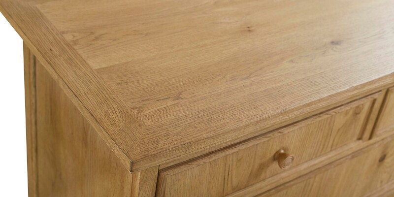 Five-drawer chest in knotty white oak with vertical-grain fronts and turned wood knobs. Soft-close glides and a cedar-lined bottom drawer; available in Flaxen or Truffle finishes.