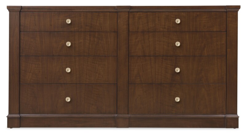 For ample storage and luxurious style, the Archives Eight-Drawer Dresser is the perfect choice. Featuring a Classic Walnut finish over figured walnut veneers, this dresser offers eight spacious drawers, including cedar-lined bottom drawers and a jewelry tray. The satin brass hardware adds a polished touch to this timeless, elegant design.