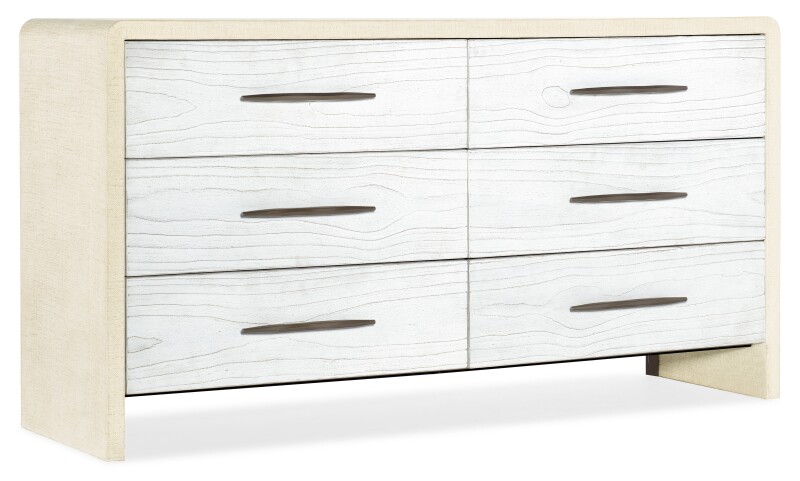Svelte and sophisticated in a serene two-tone finish combining a palette of white, cream and taupe, the Cascade Dresser with six self-closing drawers is a stylish statement piece brimming with storage. The top drawers have a removable gray felt liner, the right top drawer has a removable gray felt jewelry tray and the bottom drawers are cedar-lined. The outside of the case is in Pebble Beach, a lacquered burlap finish, and the drawer fronts are in a soft white finish in cast resin accented by champagne-colored bar pull hardware.