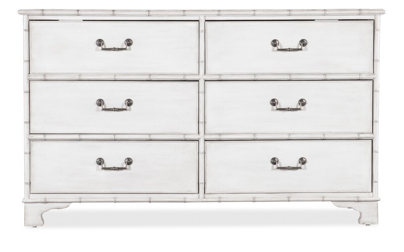 Inspired by the tropical craftsmanship of the West Indies and the cane accents of the classic British and Dutch Colonial design periods, the Charleston Six-Drawer Dresser has bamboo-motif trim and six drawers with self-closing drawer guides. The wood chest is finished in White Heron, a softer interpretation of the classic Southern limestone white with a slightly brighter sheen, delivering an heirloom-quality finish. The top left drawer has a removable felt liner and jewelry tray, and the top right drawer has a removable felt liner. The drawer interiors are painted gray, and both bottom drawers are cedar lined. Accented by antique pewter-colored decorative bail pulls.