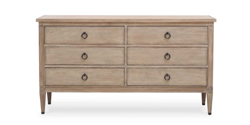 The clean, pared-down lines of the Charlotte Dresser make this 6-drawer dresser an updated bedroom classic. Tapered legs are carved with recessed lines that accent the understated carved rosettes. Each of the six soft-close drawers features a metal ring pull in a Antique Pewter finish that matches the metal leg ferrules. A moderately distressed and glazed finish accents the unique grain and carved details of the elm veneer. Choose a rich, dark Tavern finish or a light, soft Washed Elm finish.