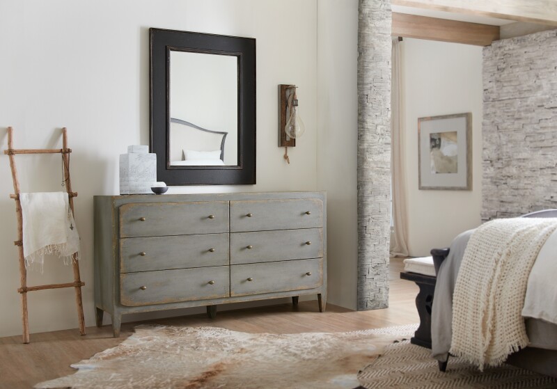 Rustic and romantic, the six-drawer Ciao Bella dresser will bring a European farmhouse ambience to your room. Crafted of Poplar and Hardwood Solids with Maple Veneer, the Time Worn Gray finish has multi-layered rub-through and is filled with character. The top 2 drawers have a drop-in felt liner, the bottom drawers are cedar-lined and there is a sliding/removable jewelry tray in the top right drawer.