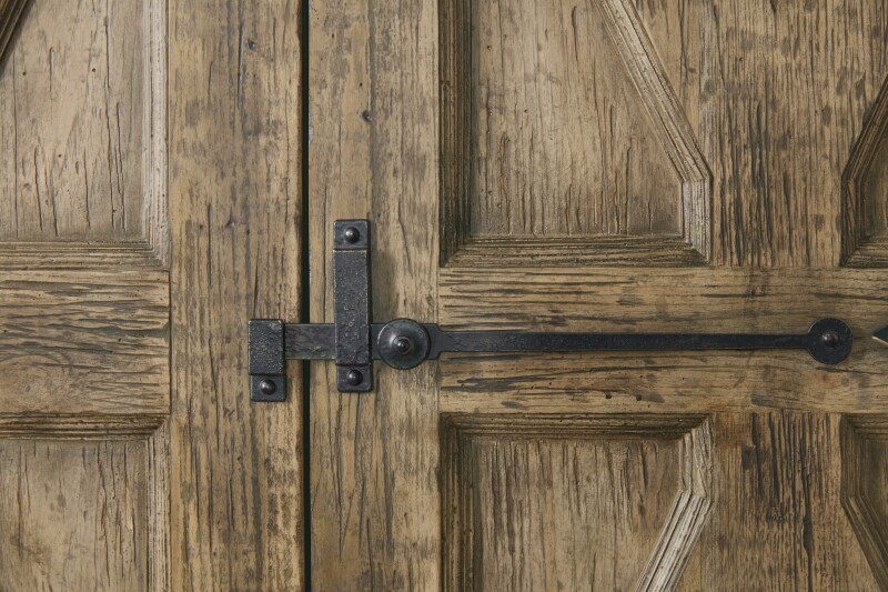 Raised diamond motifs on the case front of the Mt. Maria Wardrobe, accented by vintage-like latch hardware and hinges on the doors, exude the grandeur of the Hill Country region of Texas. Crafted of Poplar and Hardwood Solids with Pecky Hickory Veneer, the Mt. Maria is finished in Barnwood, a multi-tone brown emulating reclaimed wood. Two doors, with a mirror inside both doors. Six drawers and two adjustable shelves and a removable clothing rod