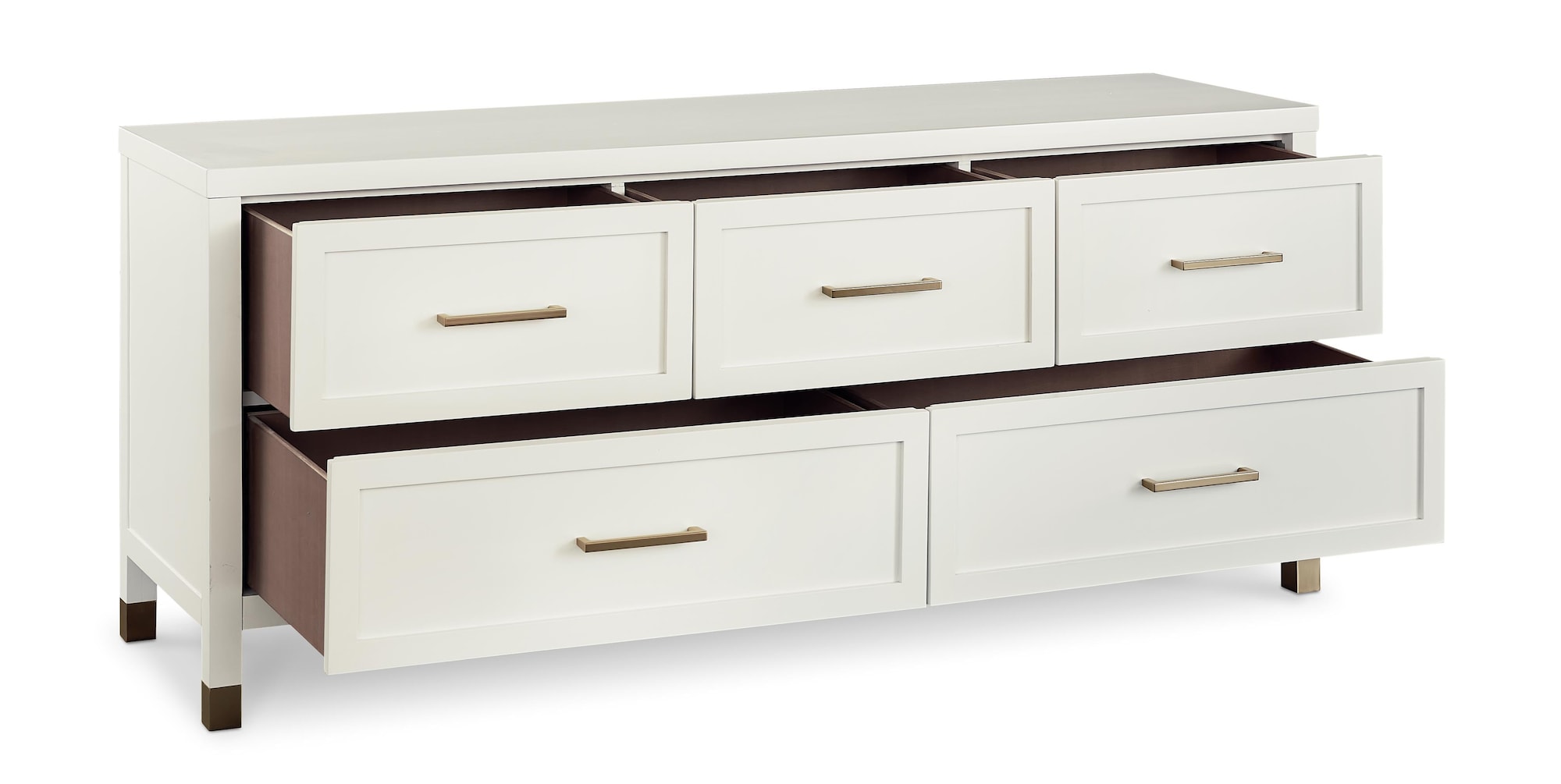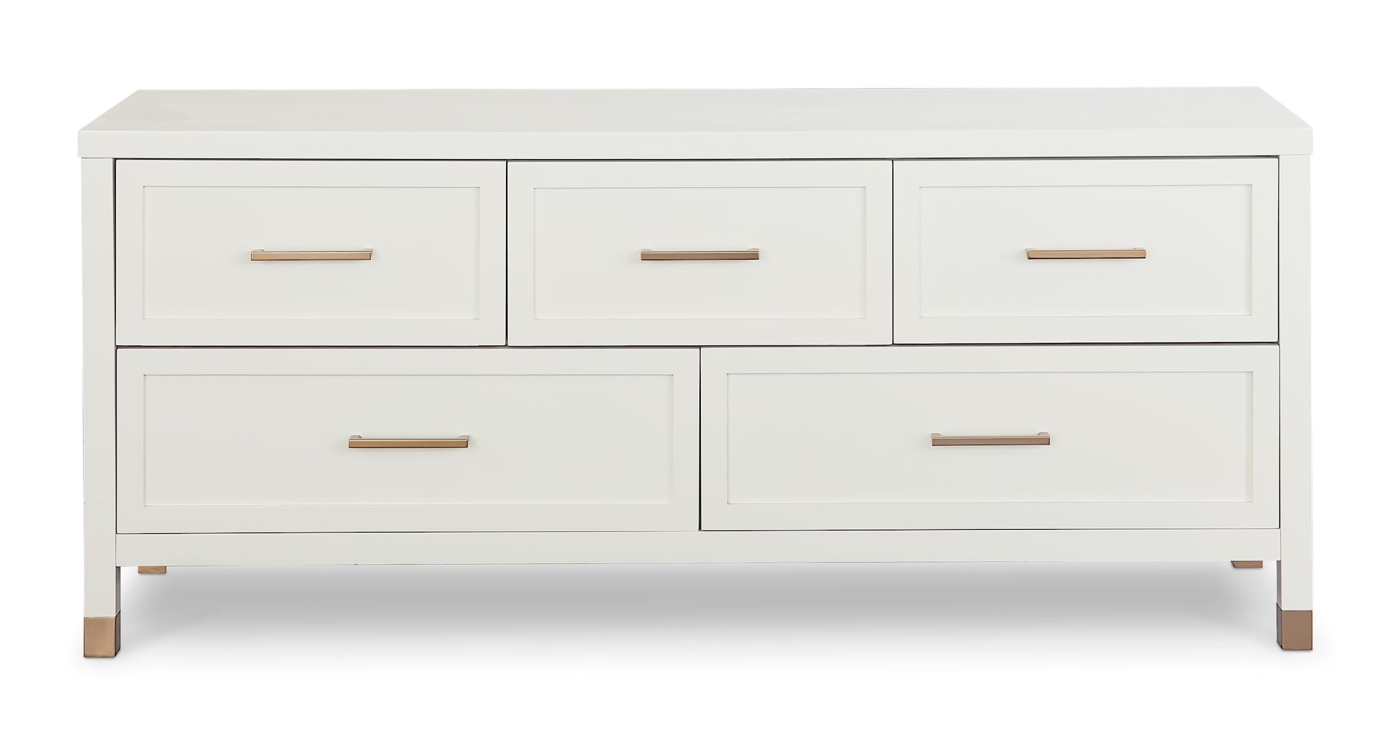 Under a window or along the wall, the classic Tidewater 5 Drawer Dresser brings a hint of mid-century modern style with its low profile. Its smooth, opaque Hampton White finish is both modern and timeless at once, accented with raised framing on the drawer fronts and sides. Metal bar pulls and leg ferrules in a satin brass finish add a touch of class.