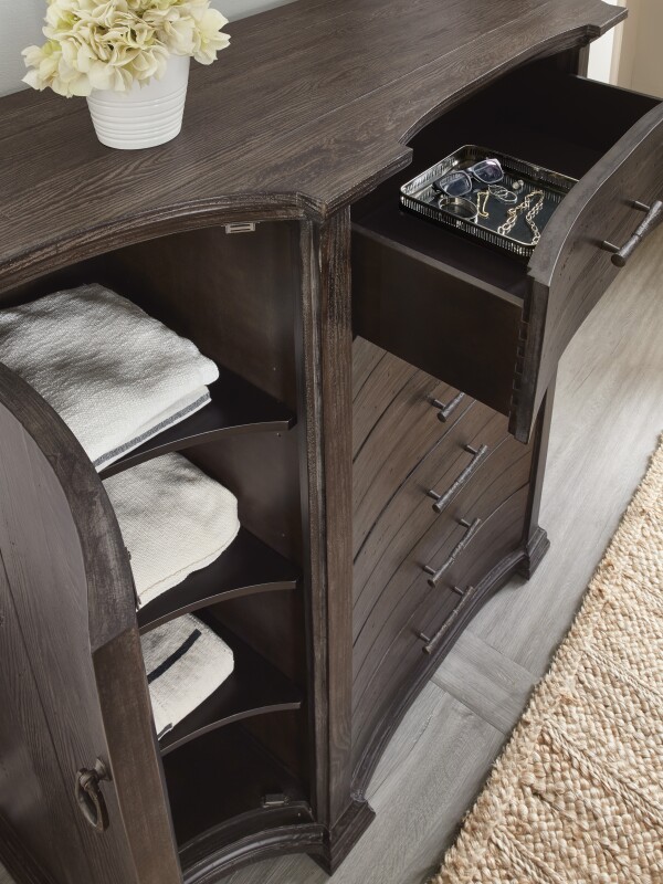 With a vintage character and fresh outlook, the Traditions Gentleman’s Chest has a beautifully-shaped front accented by pulls and rings in an aged pewter metal finish. Storage options abound with modern practicality, including six center doors and two doors with 3 adjustable wood shelves behind each door. Crafted of Pine Veneers with a Solid-Wood Edge top, the chest is finished in the relaxed Maduro, a rich brown with grey undertones. The top drawer has a removable black felt liner and the bottom drawer is cedar-lined.