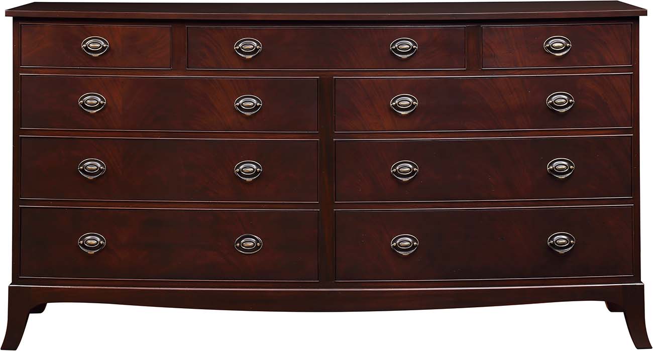 Our lovely bow-front dresser contains nine spacious, beaded drawers. The top three are velvet lined, and the top-right drawer also features a sliding velvet jewelry tray. Drawer fronts on the cherry dresser have a horizontal grain pattern, while the mahogany drawer-front grain is vertical. Oval pulls are available in Antique Gold or Pewter.