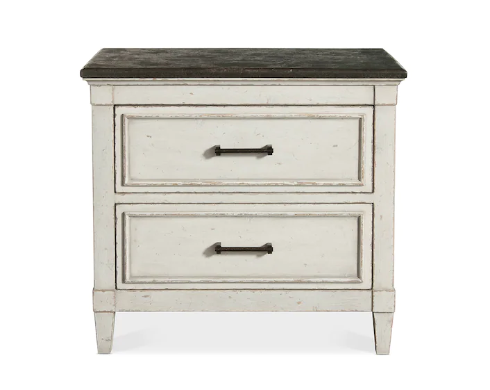 This is no ordinary nightstand. Enhance your bedroom with the Bella wood top nightstand, with an Aged Whitestone multi-step finish for the textured effect of a timeworn piece. The unique drawer pulls, finished in worn pewter, open two roomy self-closing drawers with dust dividers. One drawer conceals a receptacle power strip with 2 USB ports, so you can rest easy and recharge while your devices charge as well.