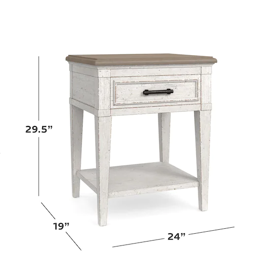 Enhance your bedroom with the stone top bedside table. The wood, enhanced with an Aged Whitestone multi-step finish for the textured effect of a timeworn piece. The self-closing drawer hides a receptacle power strip with 2 USB ports, so you can rest easy and recharge while your devices charge as well.