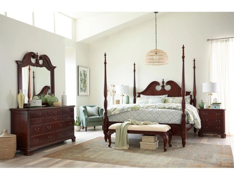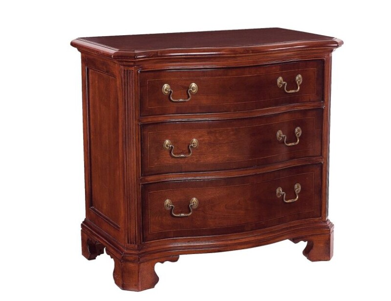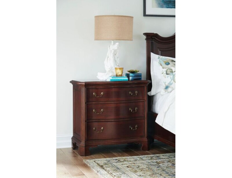 Night stand with three shaped drawers and inlays works well with any bed in this group. A little larger than the traditional night stand to allow for extra storage.