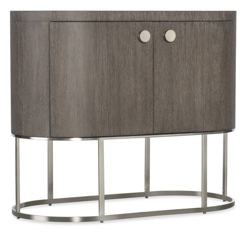 Architectural and timeless with a luxe mixture of materials, the Modern Mood Oval Nightstand is a statement piece. The shaped metal base gives the nightstand a floating appearance. Crafted with Quartered Oak Veneers, the piece is finished in a serene dark Mink color. The two doors have soft-close hinges and magnetic door catches, and there’s one adjustable shelf behind. Finished on all sides and features wire management on the back.