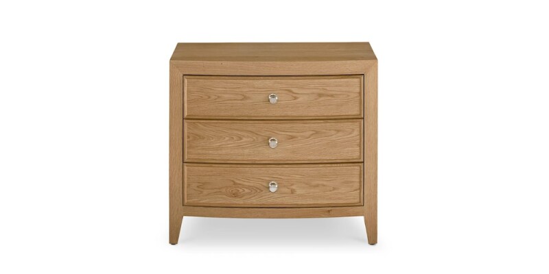 One of three night table options in the Newbury Collection, the Newbury Nightstand provides three drawers of closed storage for all your bedside essentials. With a top surface sized to allow for a lamp, books, eyeglasses, and more, we’ve designed this nightstand to play a strong supporting role in your most restful moments. It features the same framed side panels and polished nickel beehive knobs as the other pieces in the collection, allowing you to assemble a personally curated look for your bedroom. Offered in either textured White Oak or Parchment Gesso finishes.
