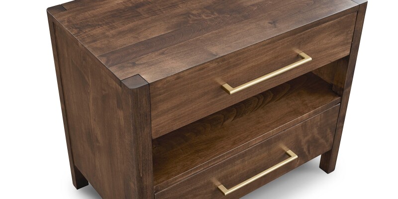 Natural silver maple nightstand with brass hardware, two soft-close drawers and an open shelf. Optional pop-up wireless charger; 30 in. W x 18 in. D x 25.3 in. H.